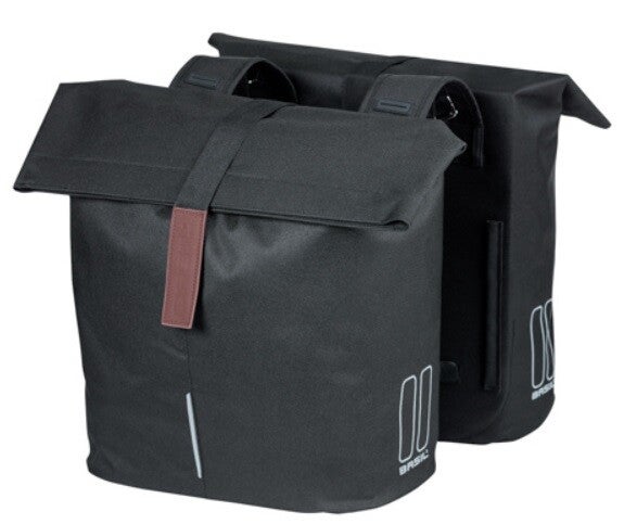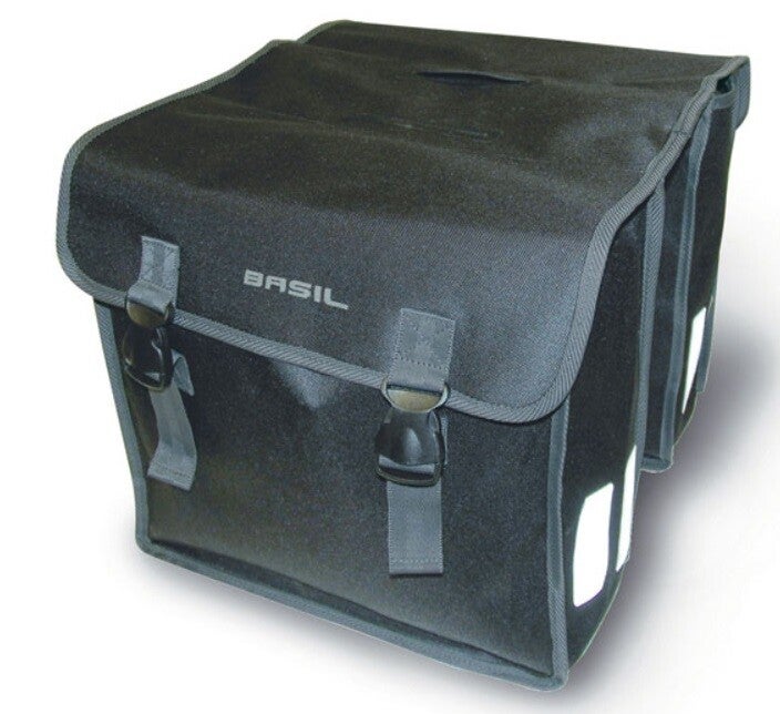 De Basil City dubbele fietstas past bij het uptempo van de city: werk, vrienden, uitgaan, naar de markt of het doen van boodschappen. De fietstas is compact, niet te groot maar toch ruim genoeg met een inhoud van 28 liter. Heb je net iets meer spullen bij je, dan vergroot je inhoud naar 32 liter. De vouwsluiting met klittenband kun je namelijk in hoogte instellen. Ook voorkomt de vouwsluiting inregenen. De tas in de kleur zwart is verder gemaakt van waterafstotend polyester. Aan veiligheid is ook gedacht, de tas is namelijk voorzien van reflectie op alle zijden en een bevestigingsmogelijkheid voor LED-verlichting.